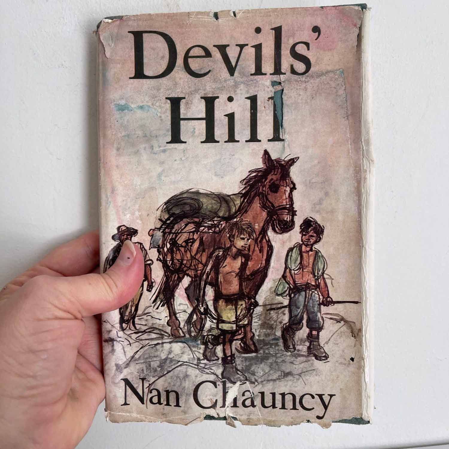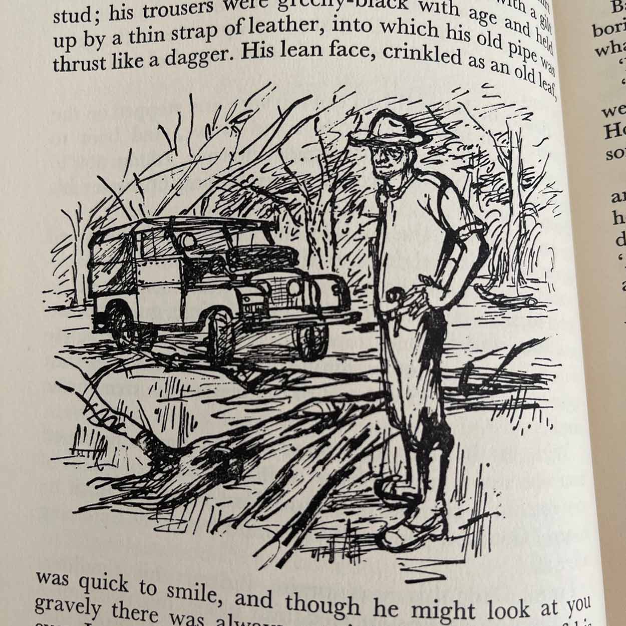 A hardcover edition with bottle green boards, silver lettering and clipped, illustrated dust cover. There is some toning and foxing but the black-and-white sketches and text are clear and legible. There is water damage to the front and back boards and the dust cover. There is tearing along the edges of the dust jacket and also to the front top area. There is a blue ink inscription on the front inside page and a previous seller’s blue ink stamp at the bottom right-hand corner. Illustrations Geraldine Spence.