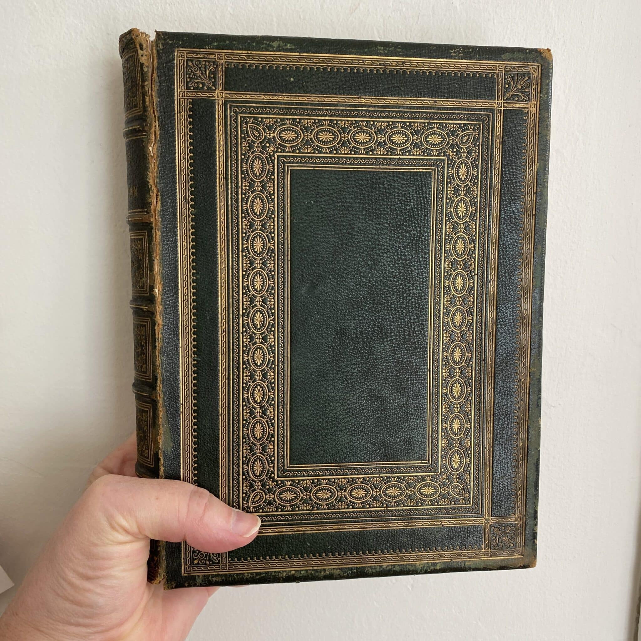 A hardcover edition with green leather boards and gilt lettering and embossing and gilt edging. The front board is detached from the spine and there is rubbing along the edges and toning and foxing throughout but the text and drawings are clear and legible. the inside front page has a small tear at bottom right-hand edge.