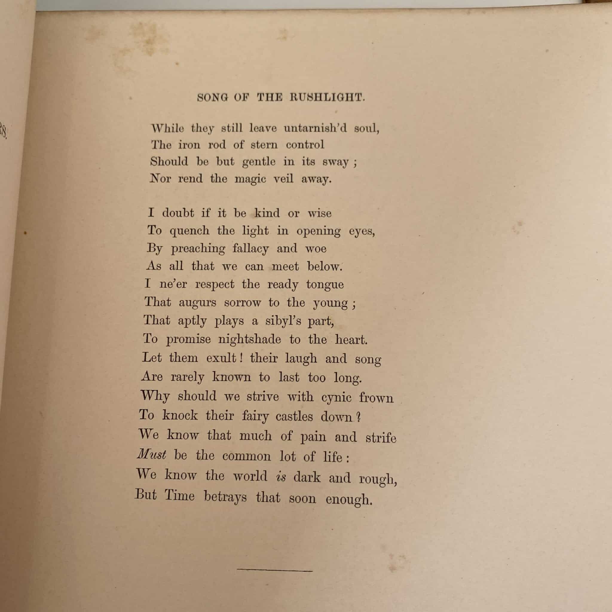 Selected poems, including the “Old Arm Chair,” a moving, sentimental tale of a young woman’s attachment to the very chair in which her mother nursed her as a baby, sat in and told her stories and then, eventually, was the place where she died. It’s a beautifully written poem which will have tugged on the heart strings of anyone reading it with strong family ties. Engravings by the Brothers Dalziel.