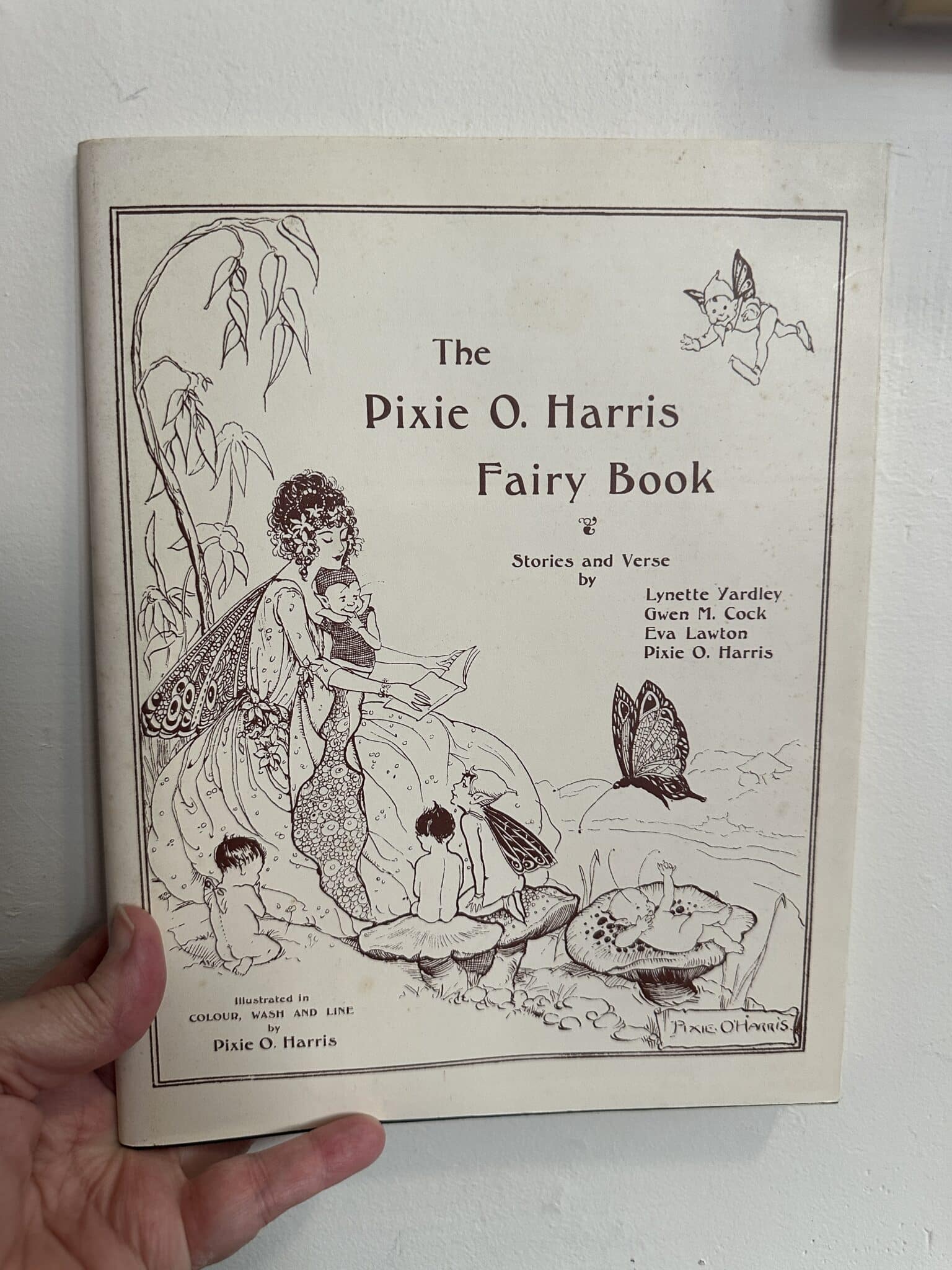 Staplebound. Condition: Very Good. Harris, Pixie O. (illustrator). Facsimile Reprint. Staplebound, 63 pages. This is the 1982 facsimile reprint of the 1925 publication, featuring black paper covers over glossy cardstock “boards”. Book is in very good condition, showing light rubbing to covers and illustrative plate affixed to front, corners very slightly rubbed , faint staining across bottom half of back cover, creases to front fold-over flap, slight creases to covers, sparse and faint spots of discoloration to several pages; otherwise in great shape with a sharp interior–sturdy binding and clean, unmarked pages throughout. Tipped-in plates and colored illustrations bright and attractive. A good copy!